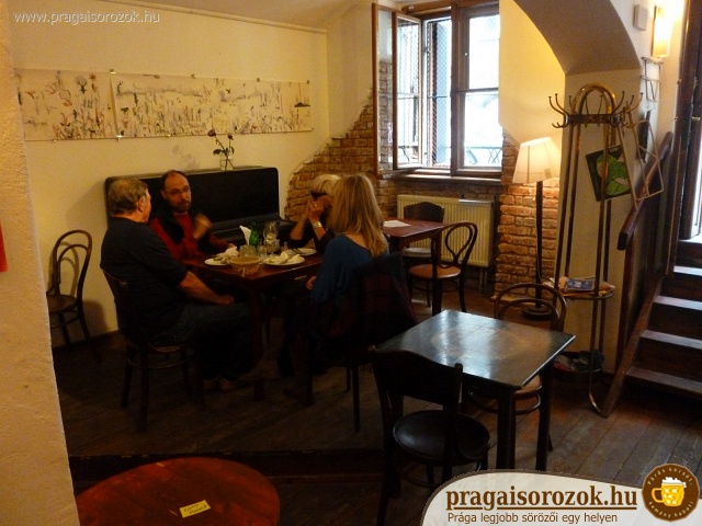 Bemegyünk mi is, hogy körülnézzünk. A falakon festmények, és fotók, a belső teremben zongora, ránézésre a vendégek kilencven százaléka is valamelyik művészeti ág képviselője, vagy egyetemista. A pultos srác egy meghökkentő tarka-barka otthonka-szerűségben mosogat, lap-topról szól a zene, a vendégek bringái bent vannak letámasztva, egy mezítlábas srác az egyik asztalnál békésen a talpát vakargatja. Laza és oldott tehát a hangulat, amelyhez bizonyára a nem hagyományos cigaretták is hozzájárulnak – Prágában egyébként teljesen legálisan.