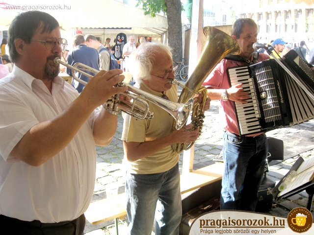 Švejk is megjelenik a sátorban: néhány perc után többen sörért indulnak, mi pedig utopenciért, amelynél ettünk már jobbat is. Ellenben a fesztiválon kapható pácolt camembert sajt (nakladaný hermelin) egészen finom, még ha átlátszó műanyagdobozból is kell villázni.